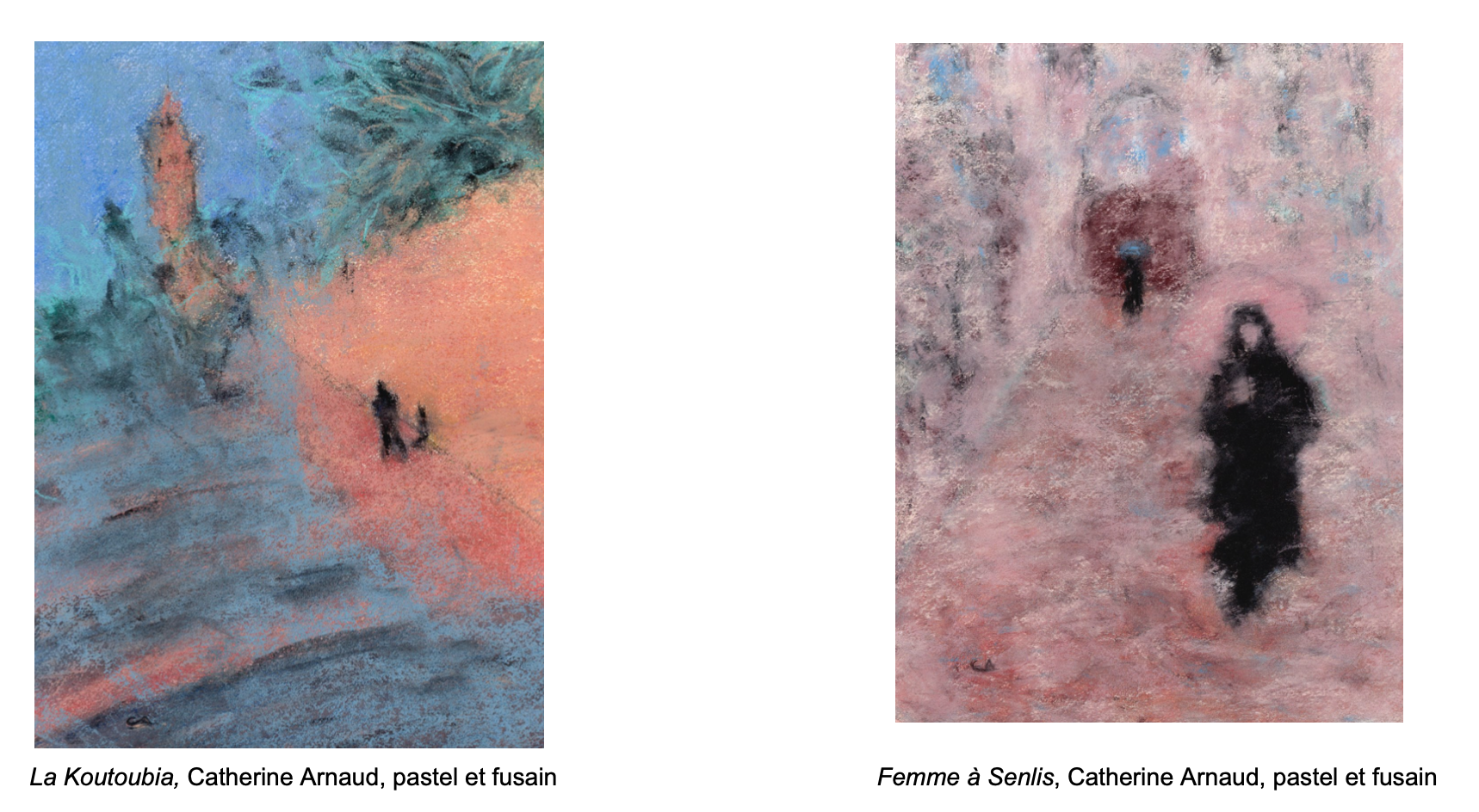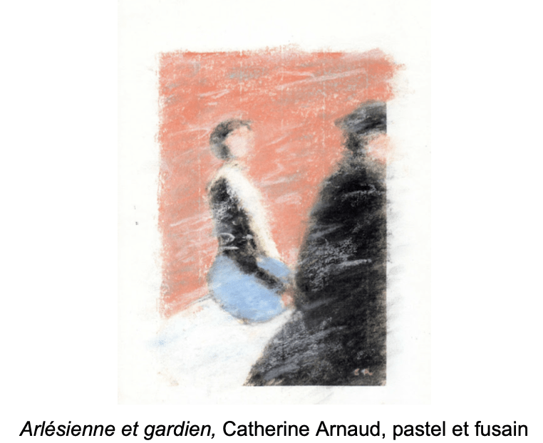 Née à Clermont‑Ferrand au sein d’une famille d’artistes, fille, petite-fille et arrière-petite-fille de photographes, Catherine Arnaud dessine depuis l’enfance, et a commencé la peinture à l’âge de 22 ans. Elle a notamment suivi les cours de Jean-Claude Athané à Paris et a participé à l’élaboration de voyages touristiques. Elle maîtrise les pastels, huiles et acryliques, développant une palette lumineuse et délicate. Son oeuvre sur papier devient alors la perception la plus immédiate de sa sensibilité : elle est l’expression, la trace impalpable du temps qui passe. L’artiste applique les couleurs par couches successives, les additionne plus qu’elle ne les mélange, et grave dans la matière, par un savant jeu d’ombre et de lumière, paysages et personnages aux couleurs chatoyantes. La douceur des traits, la transparence des couches et la délicatesse des couleurs contribuent à créer une atmosphère suspendue, comme en apesanteur.