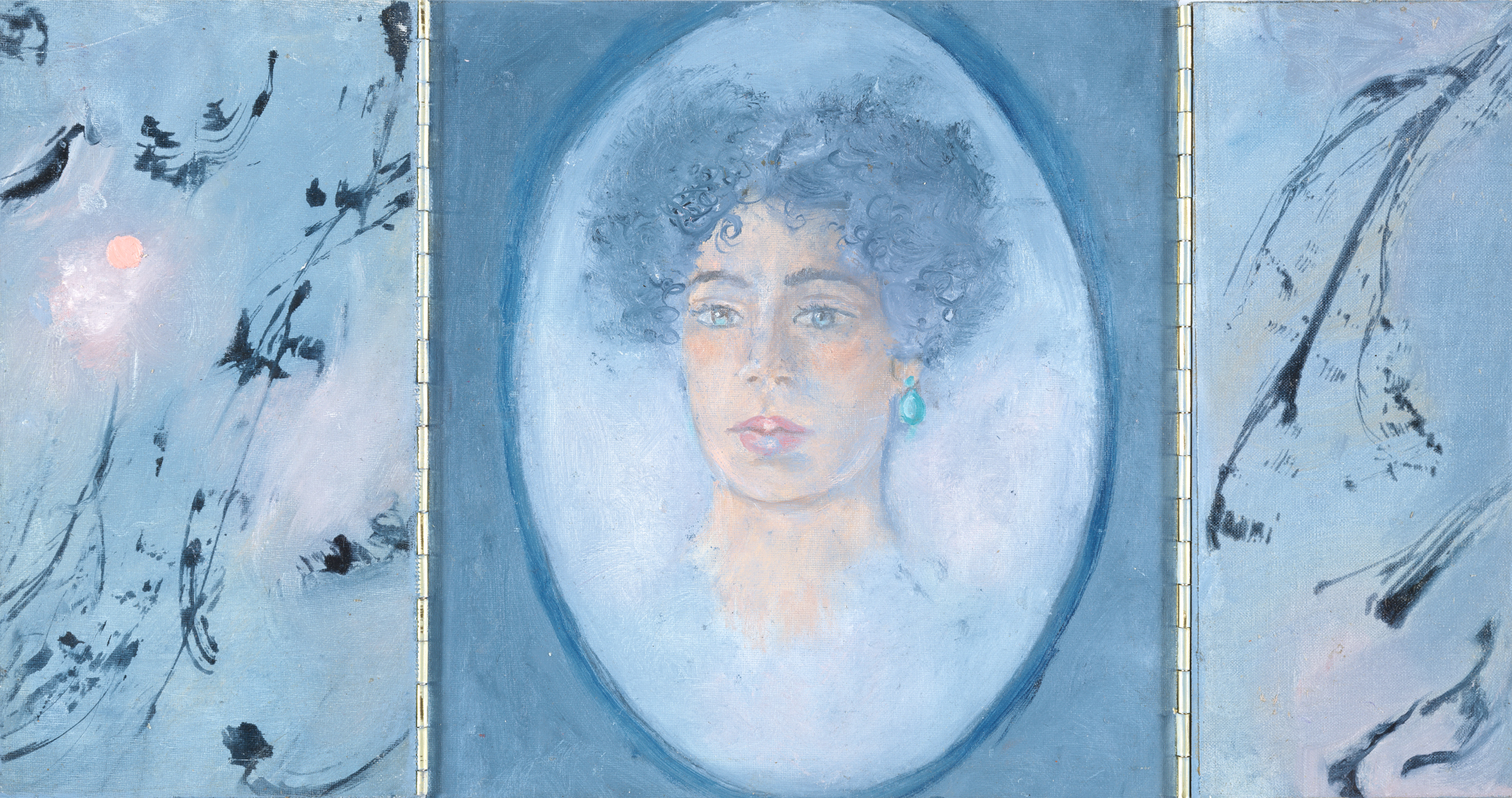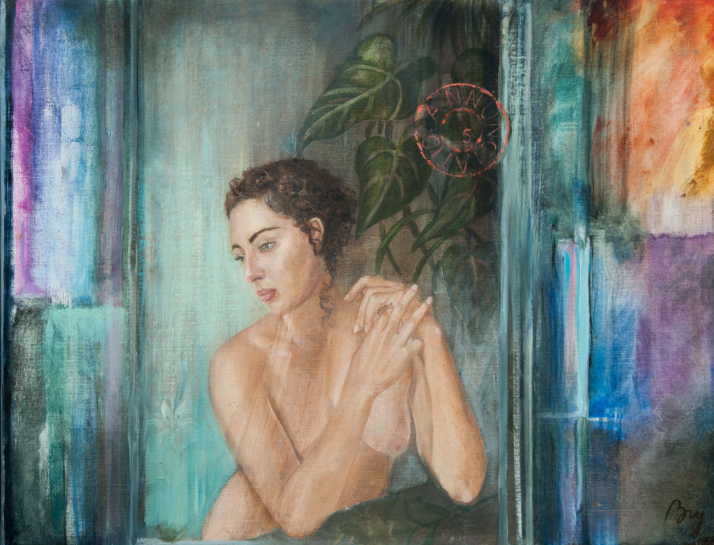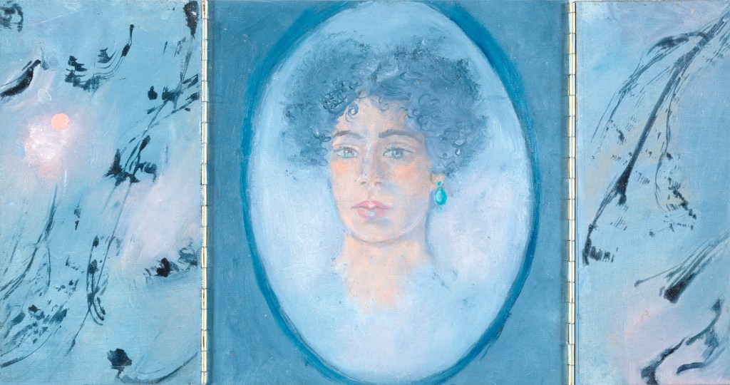 Christine Bry développe également une série de diptyques et triptyques, où les portraits féminins se mêlent à des compositions abstraites, brumeuses ou célestes. Le visage de la femme – attentif, incarné – dialogue avec des fragments de paysage ou des aplats de couleur, comme suspendus dans le temps. Le contraste entre la précision délicate du portrait et la fluidité gestuelle des fonds crée une tension poétique. Ces femmes, nues ou drapées, apparaissent à la fois puissantes et vulnérables, présentes et intemporelles. Ces œuvres racontent une intériorité silencieuse, à la frontière du regard et du rêve.