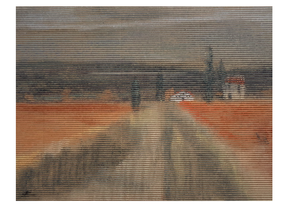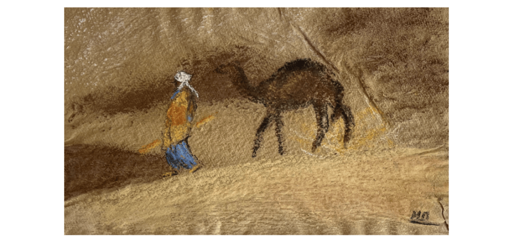 Le contour précis de ses esquisses de voyage, le recul et la liberté prise sur ses croquis baignés de lumière méditerranéenne, lui fait retrouver cette spontanéité qui amène la réalité au bord du rêve. Ses œuvres ont la patine du temps, précises mais légères. Entourés du halo lumineux du souvenir, ses paysages à peine esquissés laissent, sur la feuille, la matière affleurer. Les papiers, kraft, maïs, la peau de chameau, le carton ondulé, le papyrus, la feuille de bananier, deviennent parchemin de la mémoire et surgissent semblables à des signes gravés dans la matière, jaillissant comme autant de parfums, de paysages suggérés. Son talent d’artiste lui fait choisir le carton ondulé pour que le trait saccadé et interrompu mette en scène une caravane de chameaux ou plonge Venise dans des brumes éthérées. L’utilisation des imperfections du papier fait souvent surgir l’émotion, les couleurs judicieusement choisies, jamais provocantes font qu’elles s’harmonisent avec le sujet.