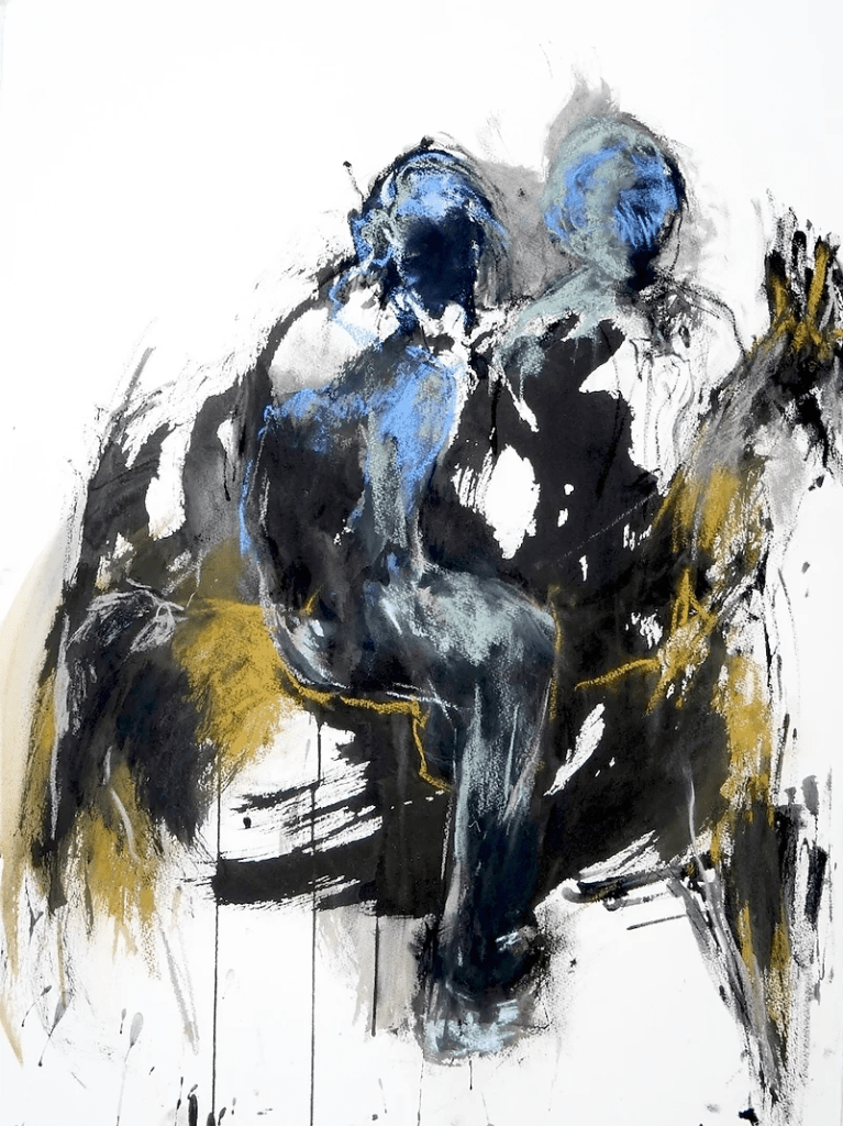 Dans ses dessins, Catherine Duchêne explore la dynamique du geste pur. Les silhouettes y sont ébauchées avec une rapidité fébrile, comme saisies dans l’instant. Les touches de couleur viennent souligner un mouvement, une émotion fugace. Les corps se dissolvent dans l’espace blanc du papier, dans une tension entre figuration esquissée et dissolution.