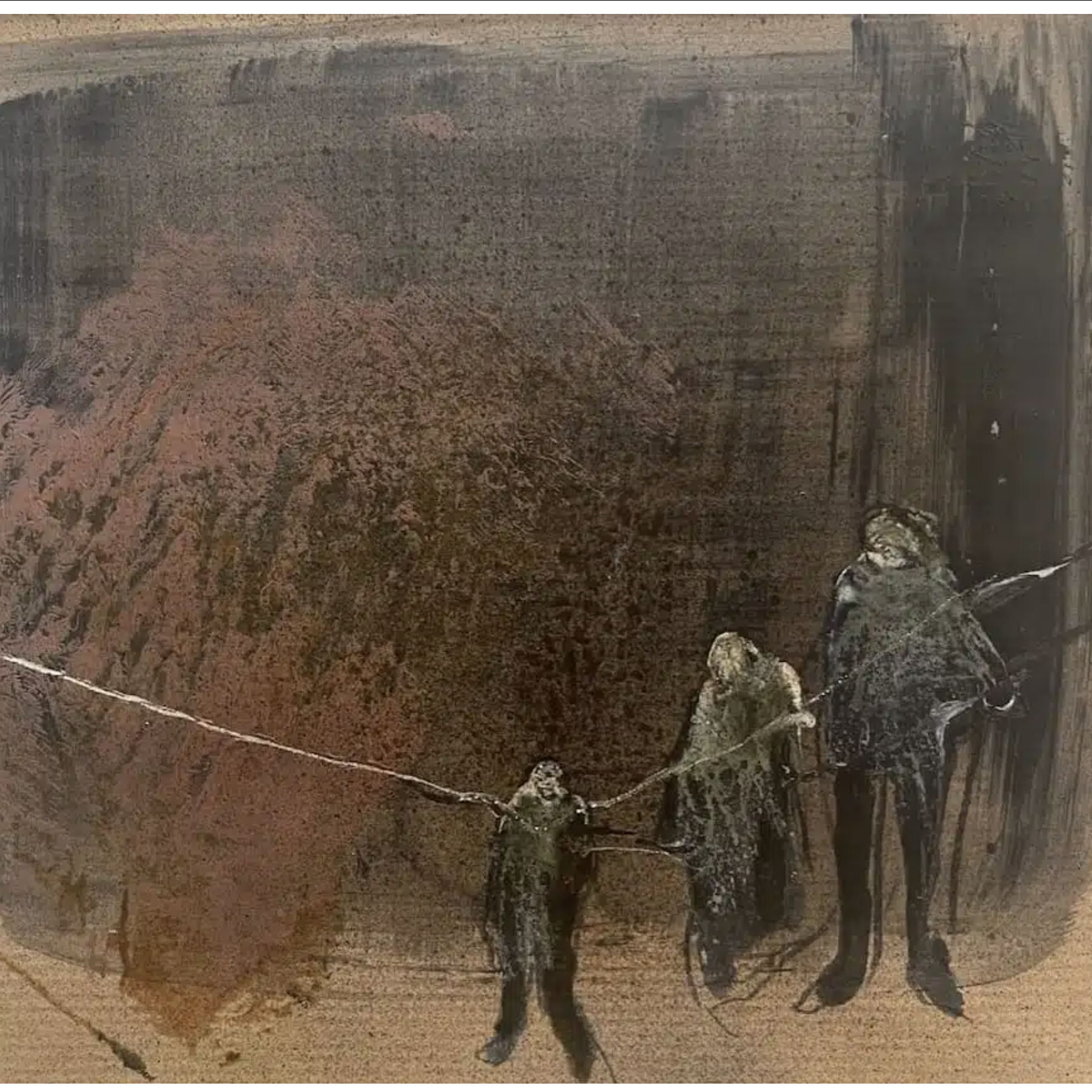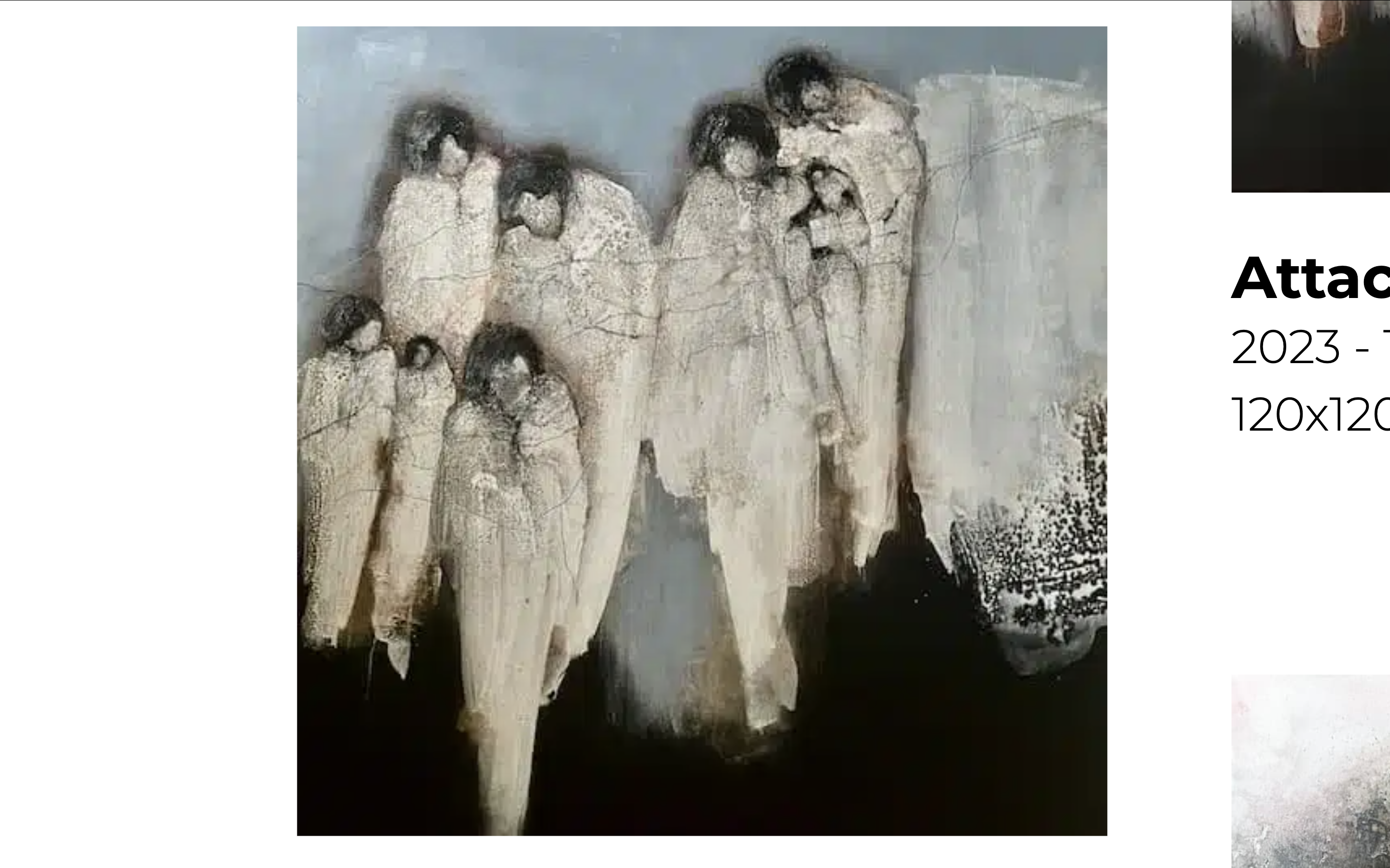 Les fils à linge, omniprésents dans ses toiles, deviennent bien plus que de simples éléments visuels : ils sont métaphores du lien affectif, du souvenir suspendu, de la mémoire qui relie malgré la distance. Ces fils tendus, noués, parfois entravants, racontent les histoires silencieuses de ceux qui ont tout quitté, souvent à pied, portés par la seule force de l’espoir. Draps blancs, rochers, montagnes et silhouettes flottantes esquissent une géographie de l’exil, où les paysages sont autant intérieurs qu’extérieurs.